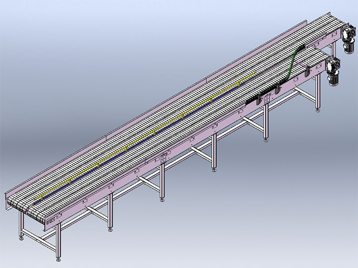 鏈板輸送機(jī)是一種以標(biāo)準(zhǔn)鏈板為承載面,由馬達(dá)減速機(jī)為動力傳動的傳送裝置。鏈板式輸送機(jī),由動力裝置(電機(jī))、傳動軸、滾筒、張緊裝置、鏈輪、鏈條、軸承、潤滑劑、鏈板等等構(gòu)成。其中帶動物料的輸送的主要的兩個部分為:鏈條,利用它的循環(huán)往復(fù)運(yùn)動提供牽引動力;金屬板,作為輸送過程中的承載體??梢酝ㄟ^多列鏈板并行,使鏈板輸送機(jī)做的很寬并形成差速,利用多列鏈板的速度差使多列輸送在無擠壓的情況下變?yōu)閱瘟休斔?,從而滿足飲料貼標(biāo)、灌裝、清洗等設(shè)備的單列輸送的要求,我們可以將兩條鏈板輸送機(jī)的頭尾部做成重疊式的混合鏈?zhǔn)沟闷浚ü蓿w處于動態(tài)過度狀態(tài),使輸送線上不滯留物料,可以滿足空瓶以及實瓶壓力和無壓力輸送。
